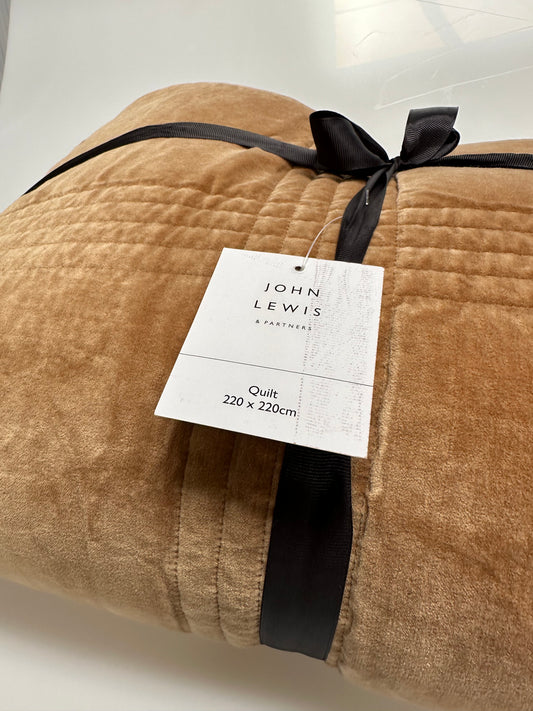 John Lewis Cotton Velvet Check Quilted Bedspread, Caramel