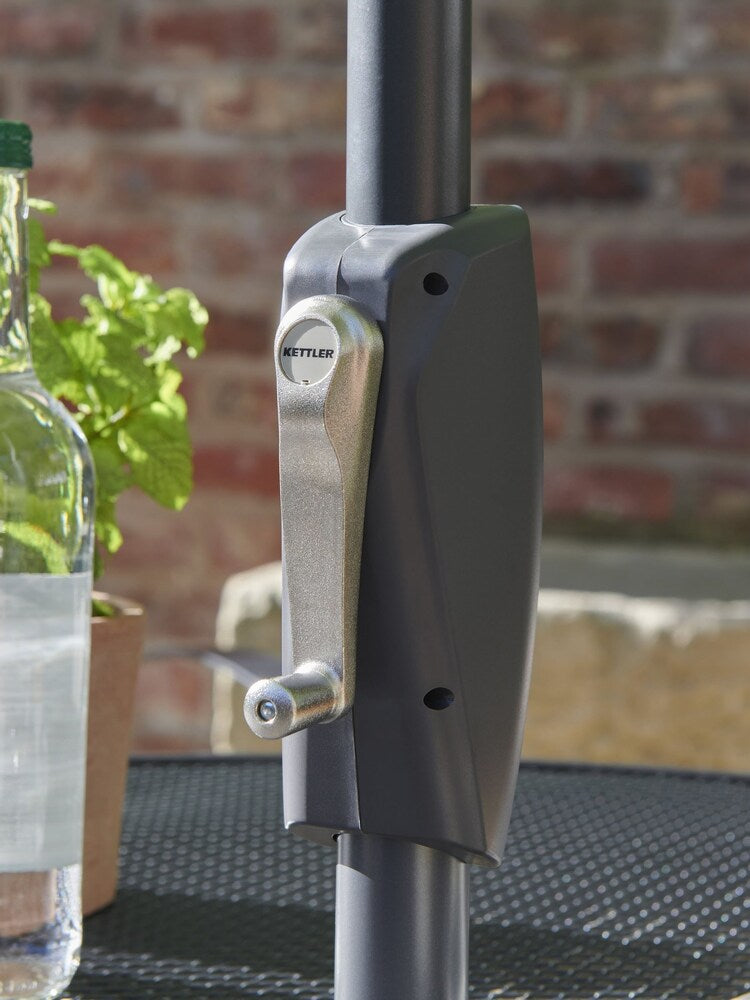 KETTLER 2.5m parasol with a simple wind-up mechanism making it easy to put up or down with the added bonus of a tilt facility to control shade.