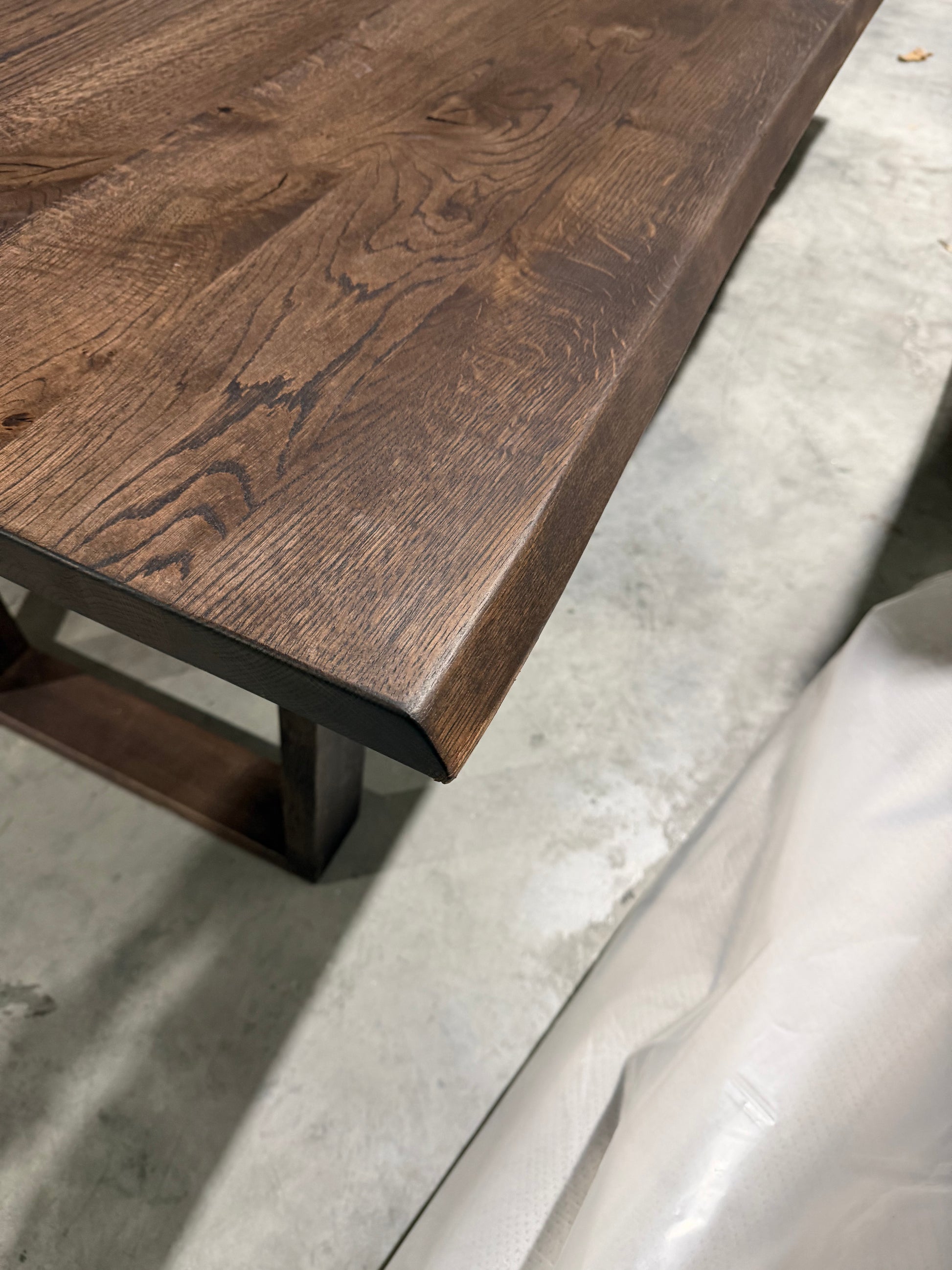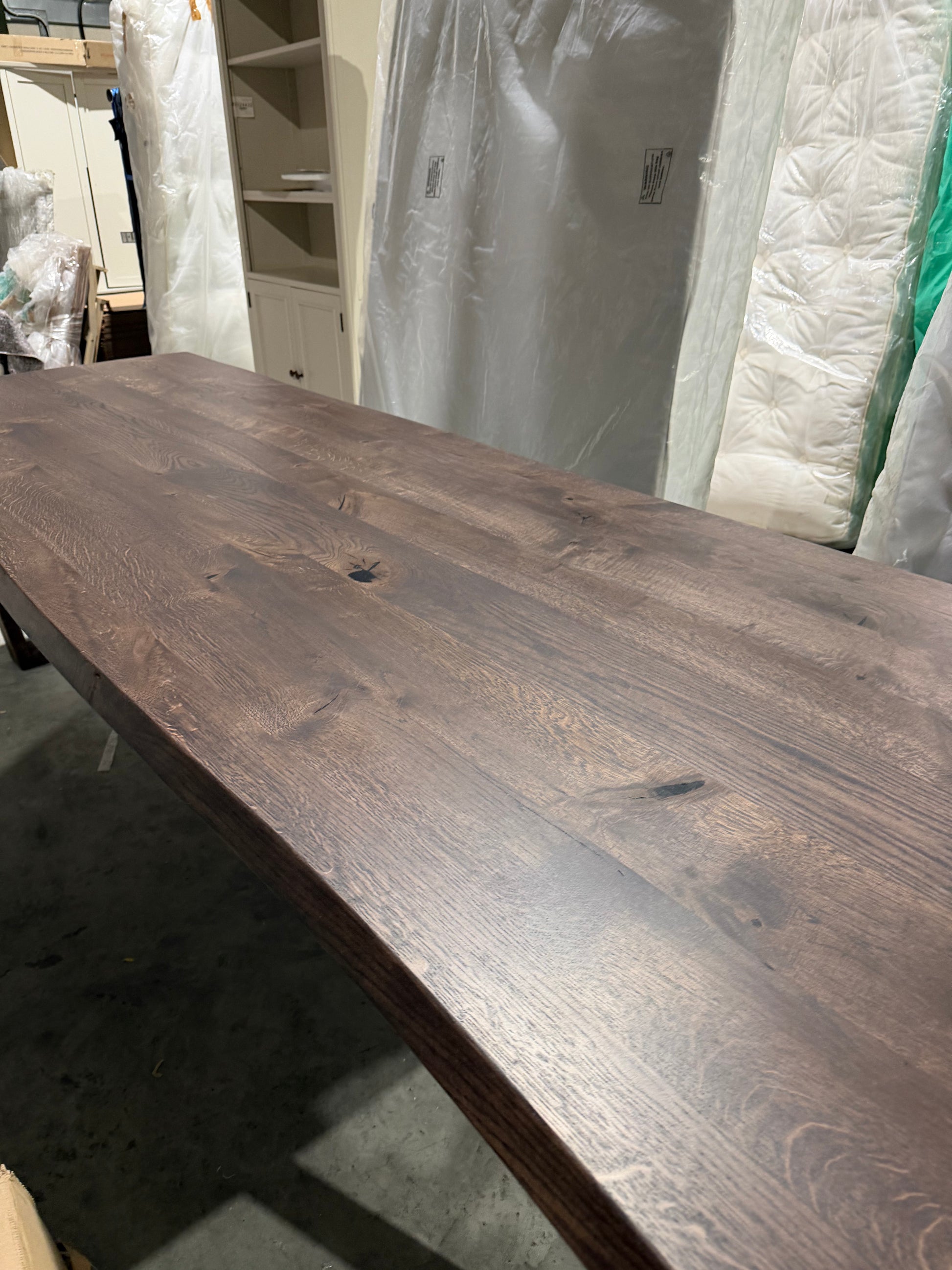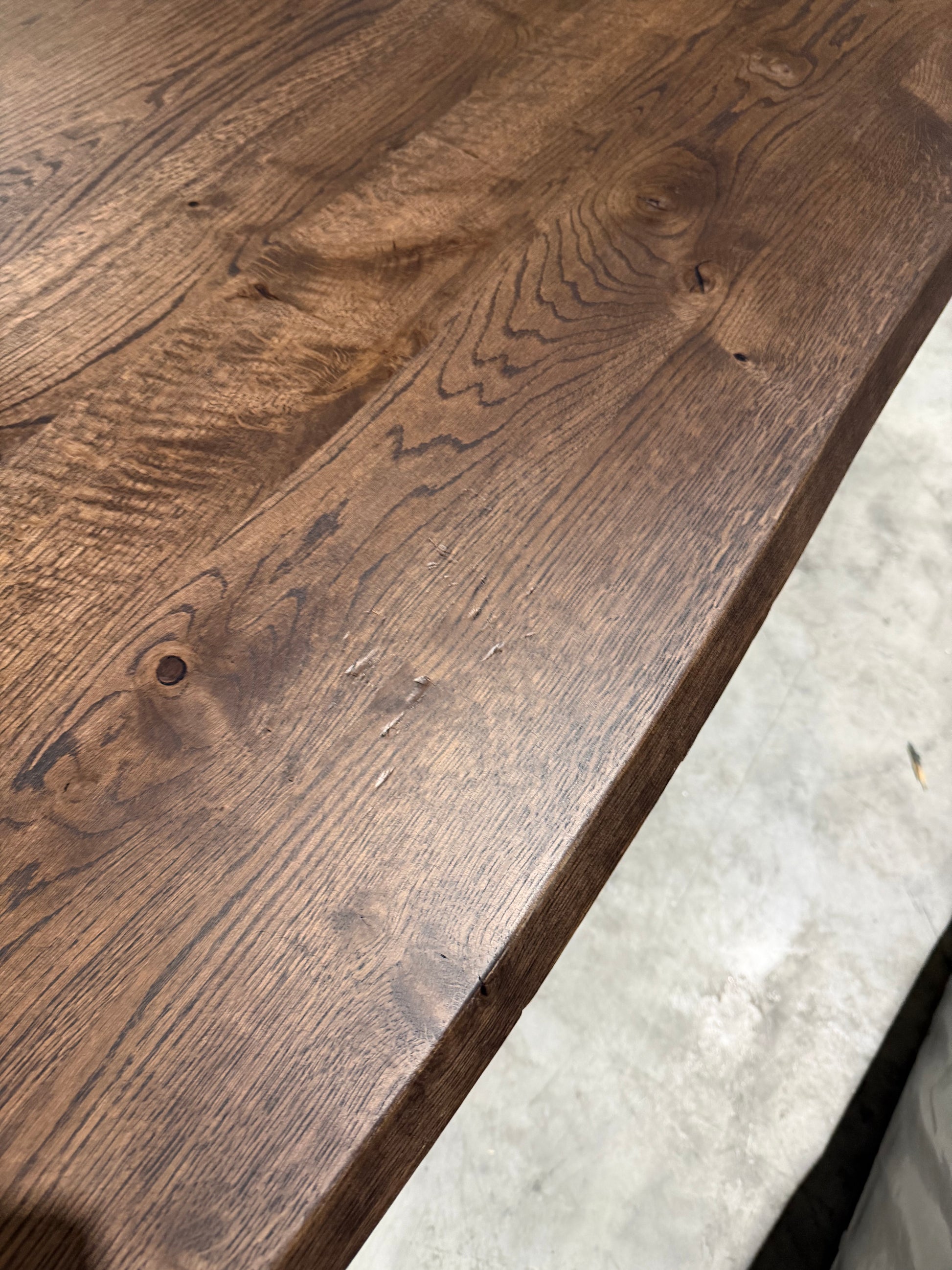 Every table top is unique, just like no two trees are the same. Each table one is made from rustic boards and fused together. The boards may feature knots, splits and cracks that are carefully filled with a black filler. Medullary rays are common on oak boards and should not be mistaken for flaws.