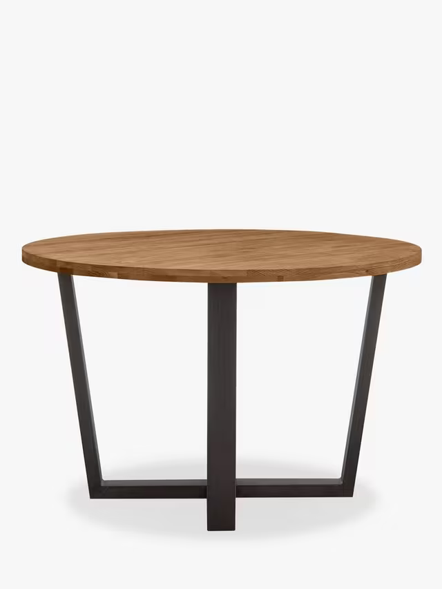 This solid, round dining table offers seating for up to six diners. Supported by a robust, welded iron base that's finished with a durable lacquer, it has a striking and industrial-inspired aesthetic. It is easy to assemble and ideal for smaller spaces.