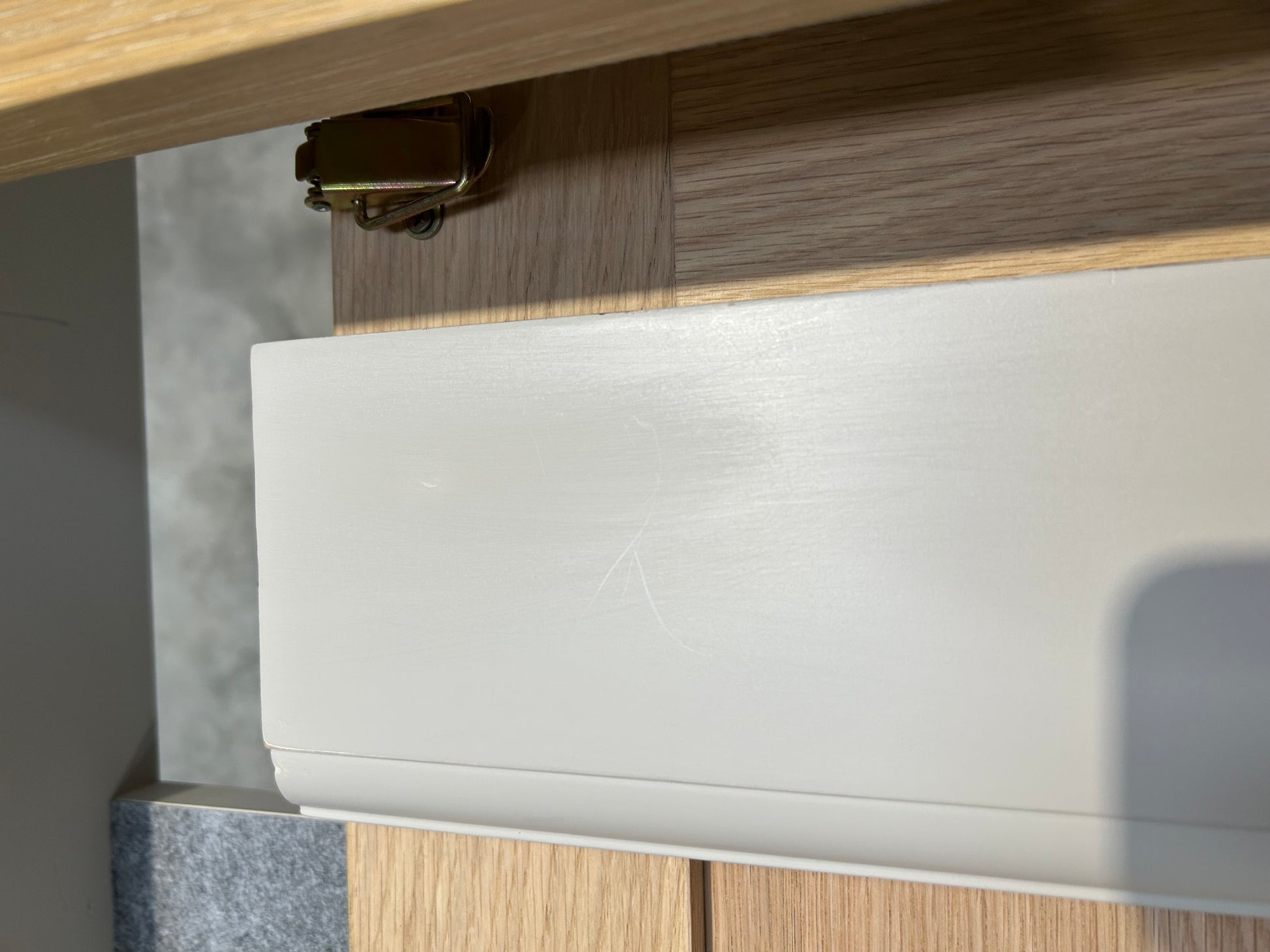 The hardwearing paint finish is beautifully complemented by aged brass effect handles and barrel hinges and coordinates well with other soft tones, as well as natural materials such as wicker and linen.