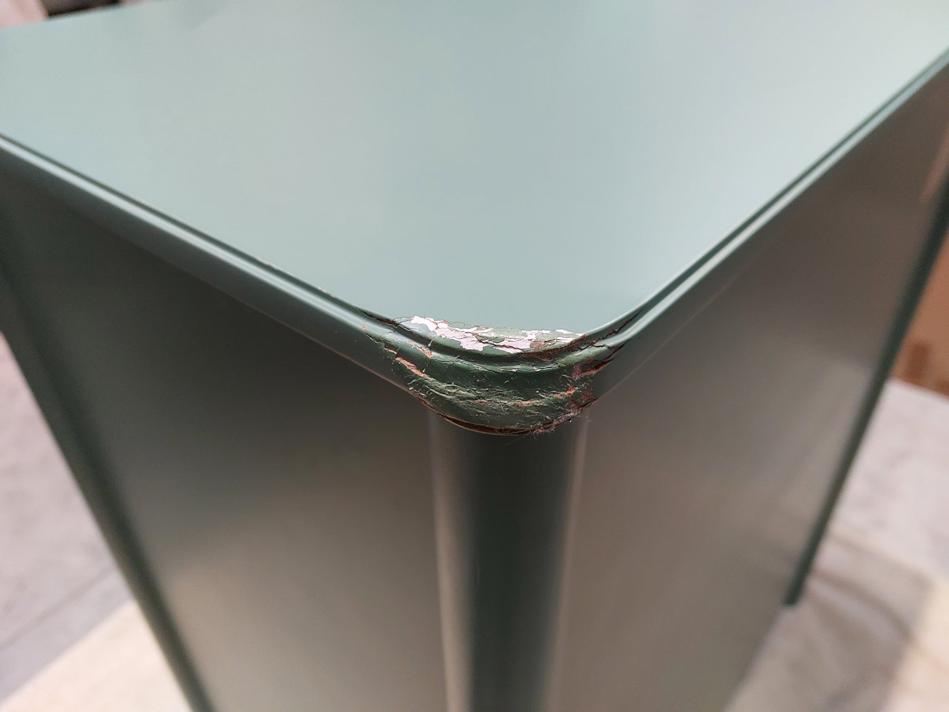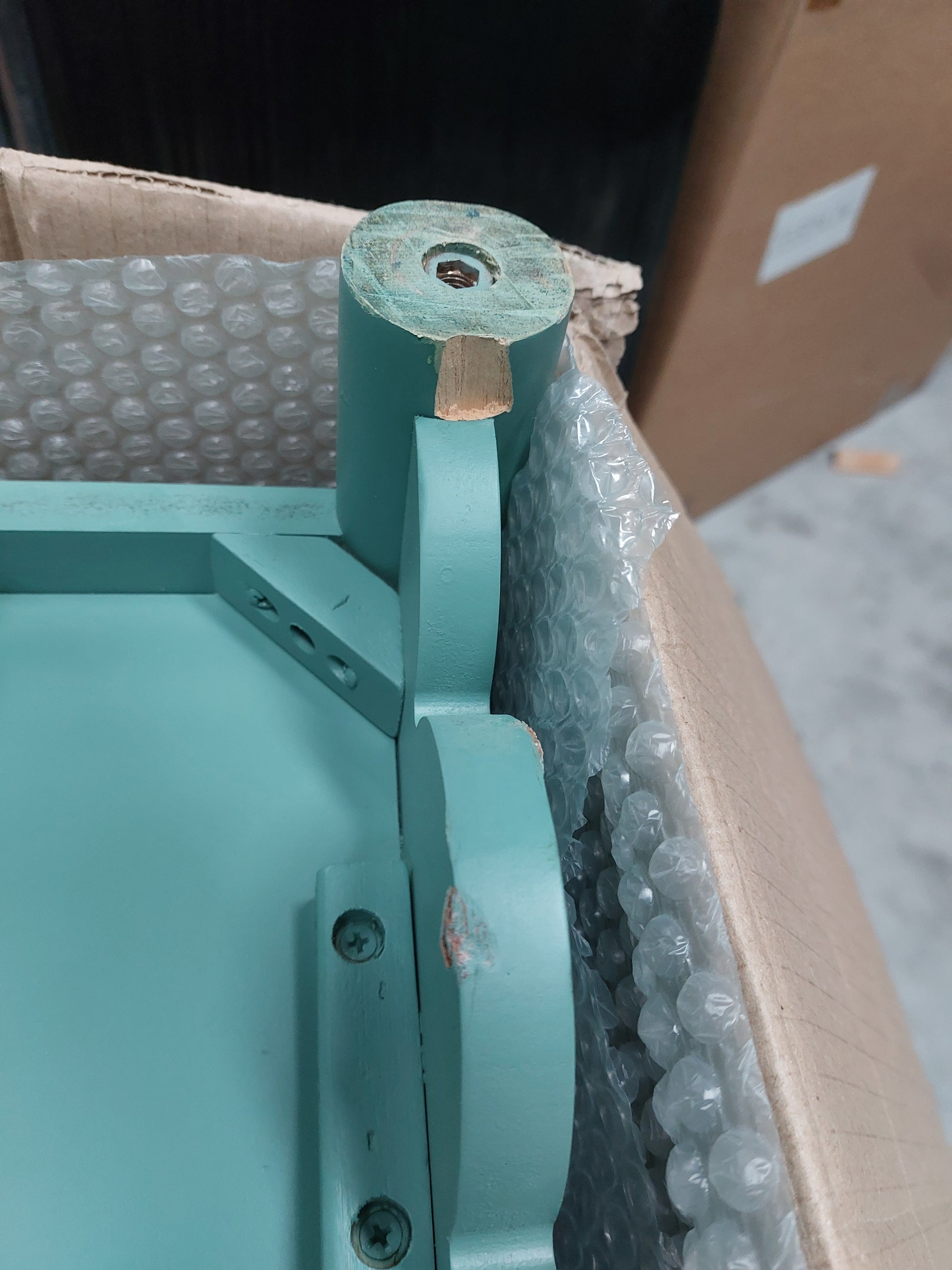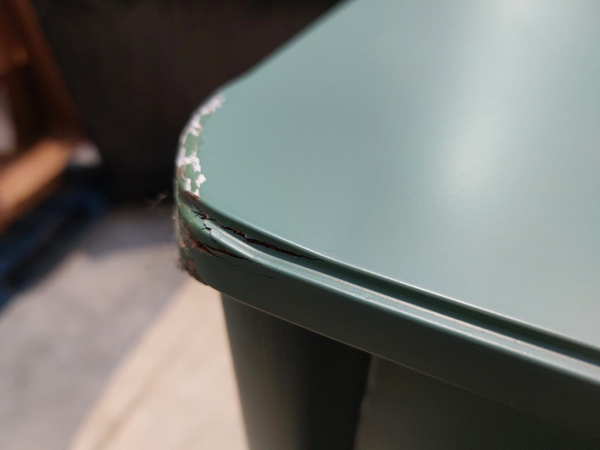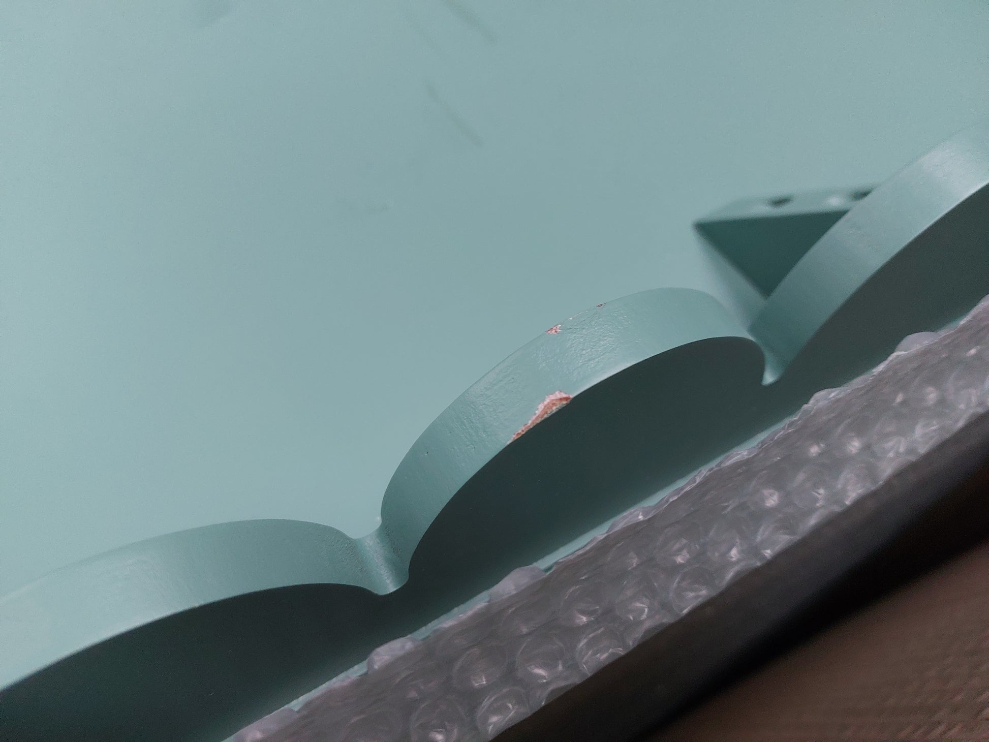 Couple of dents in scalloped hem underneath an chip missing from rear leg connecting point.