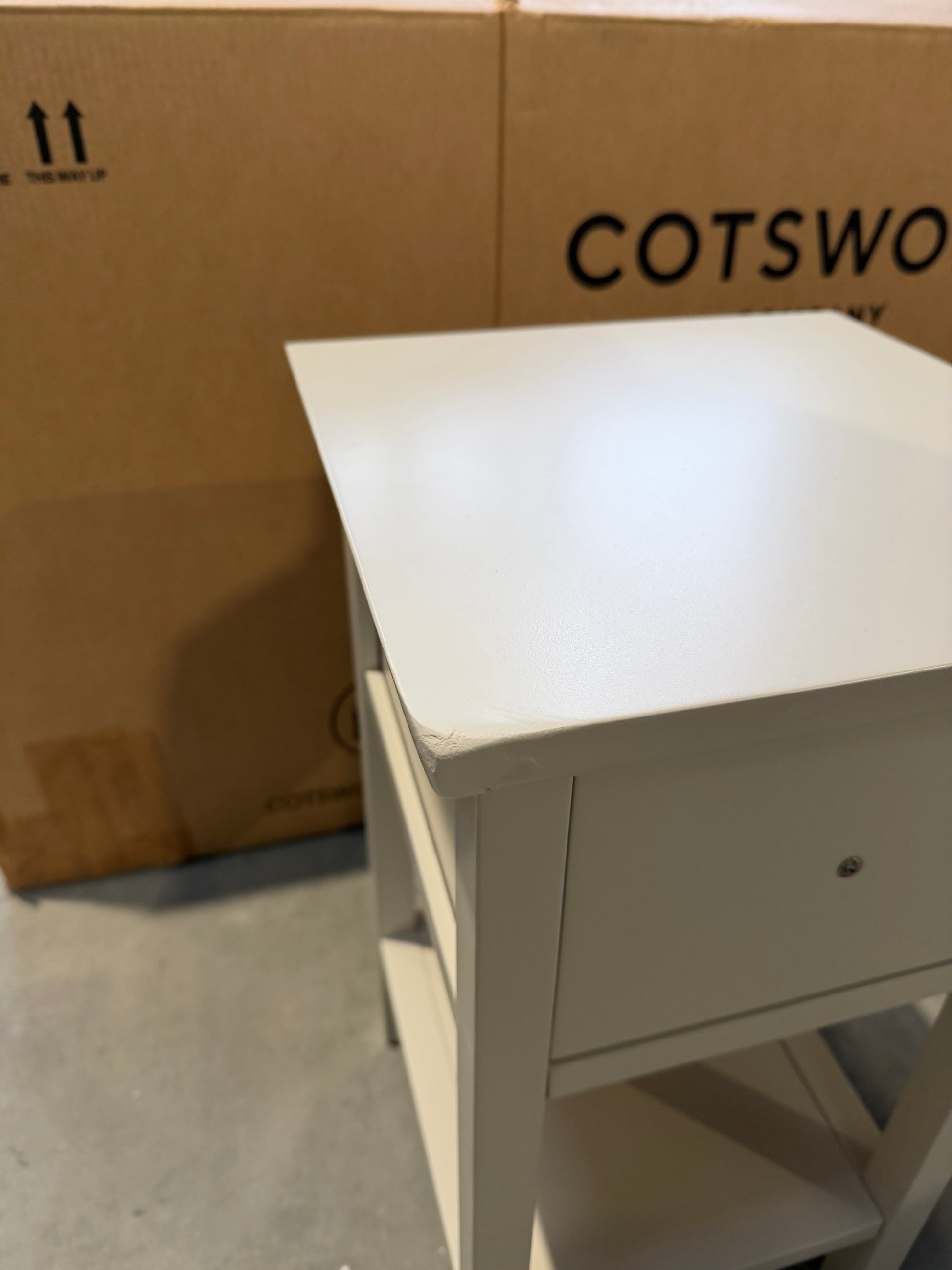 Grade B- One of the bedside tables has damage to the LHF corner as pictured.