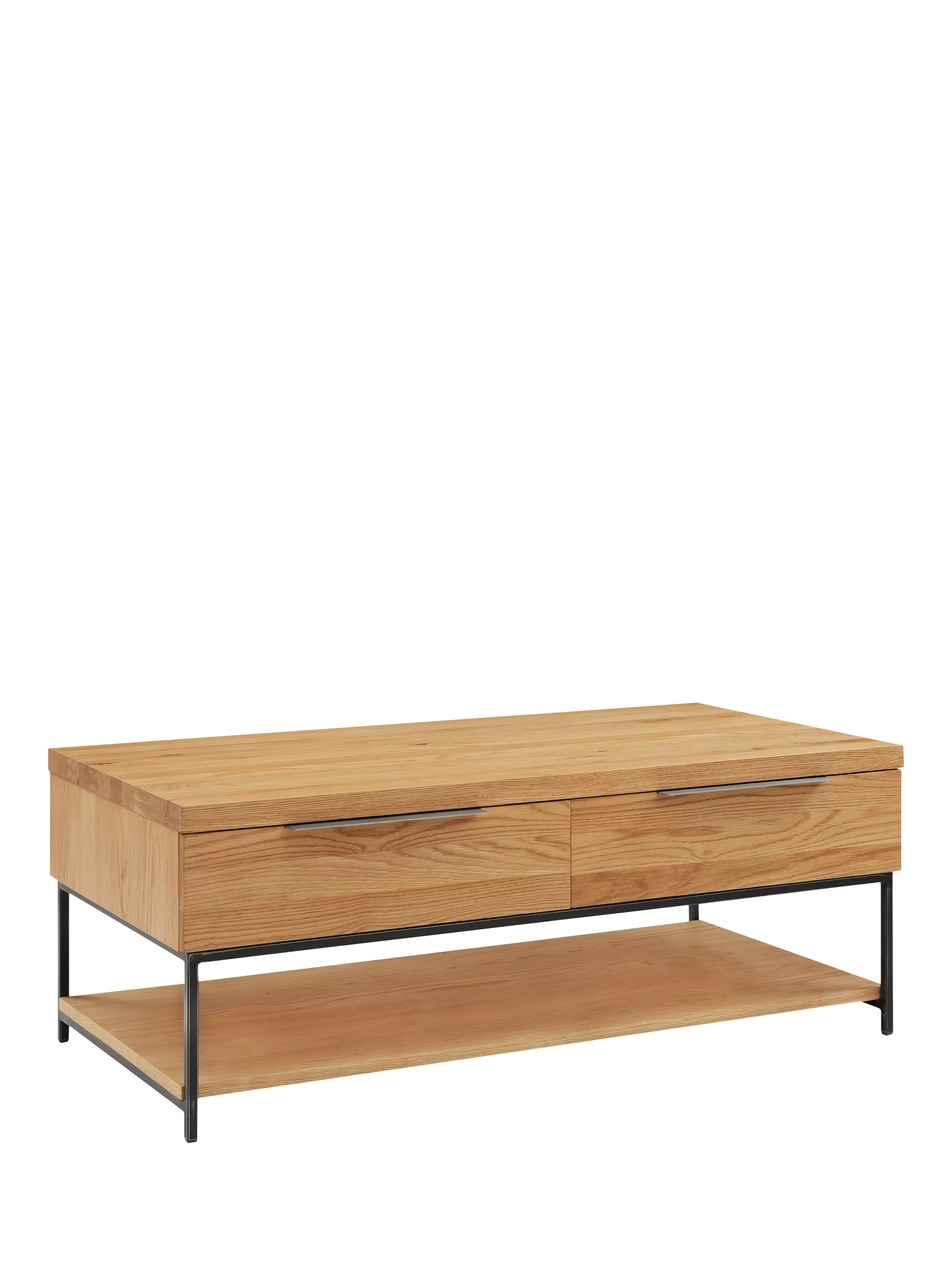 This industrial-inspired coffee table is simple and functional in design, it is supported by a robust, welded iron frame that's finished with a durable lacquer. Two drawers and a spacious lower shelf let you tidy away remote controls and other devices, coasters, magazines and other living room clutter.