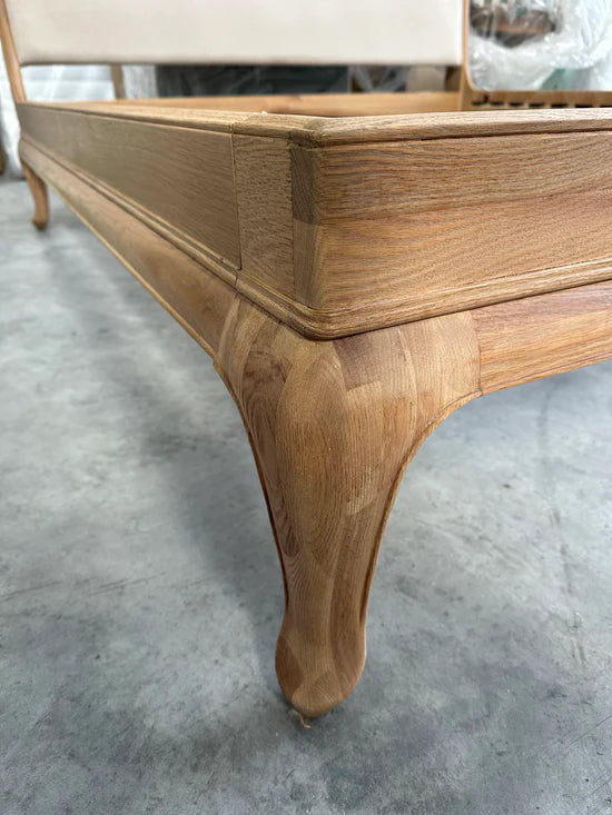 Craftsmanship at its finest. With an air of classical nostalgia, our Louis bed frame is made from solid white oak in a natural lacquer. Its weathered finish brings out the warmth of the wood and highlights its distinctive grains and tones. Handcrafted carvings on the frame honour its authentic period style and complement the fabric upholstery on the headboard. We've also added supportive sprung slats to the base. It's all the little details that help to make this bed frame a focal point in your bedroom.