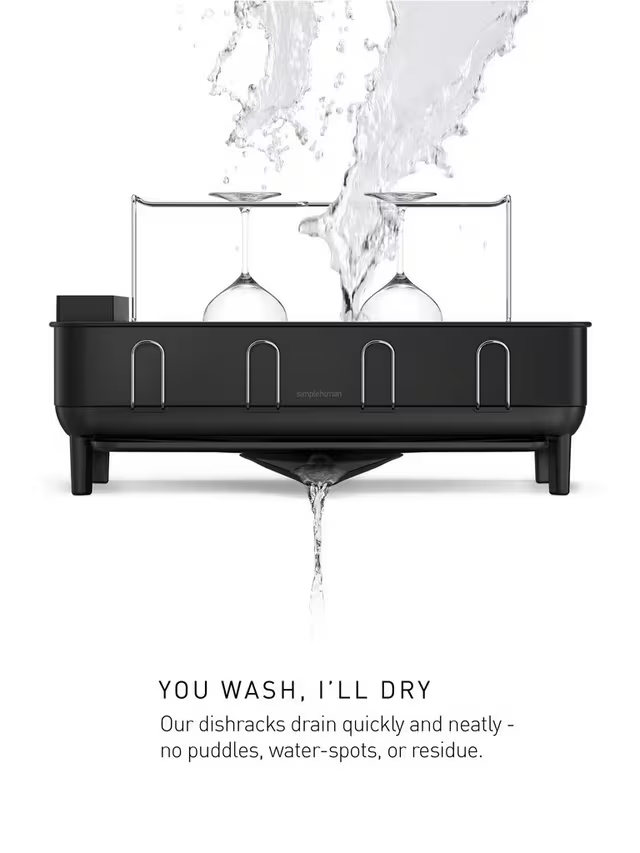The simplehuman steel frame dish rack has a solid stainless steel frame that matches the aesthetic of modern upscale kitchen appliances. Its swivel spout rotates 360 degrees in any direction so it drains water directly into the sink - no matter how you place the dishrack on your countertop - and can be removed for easy cleaning. An anti-residue coating prevents residue buildup and water spots.