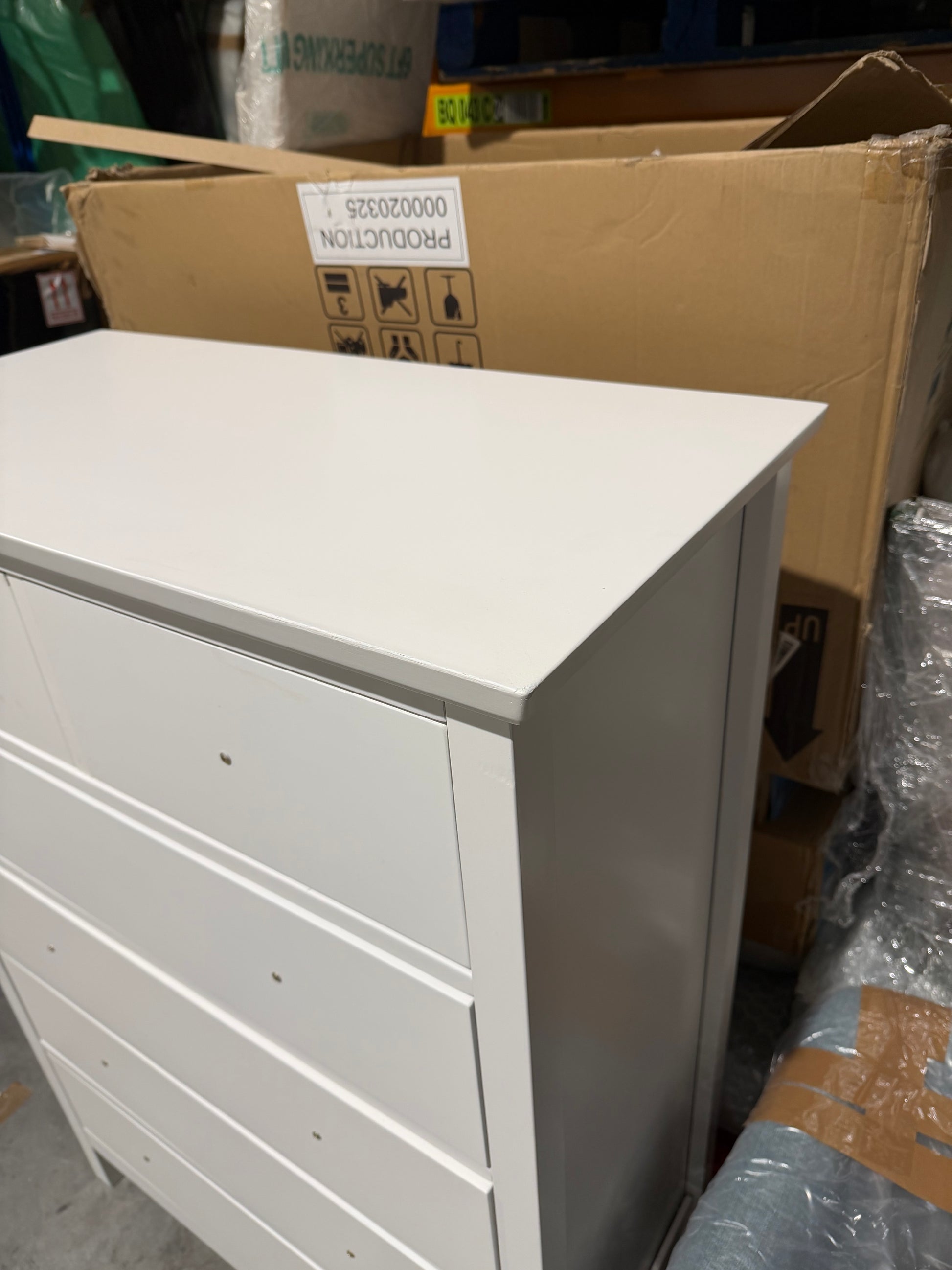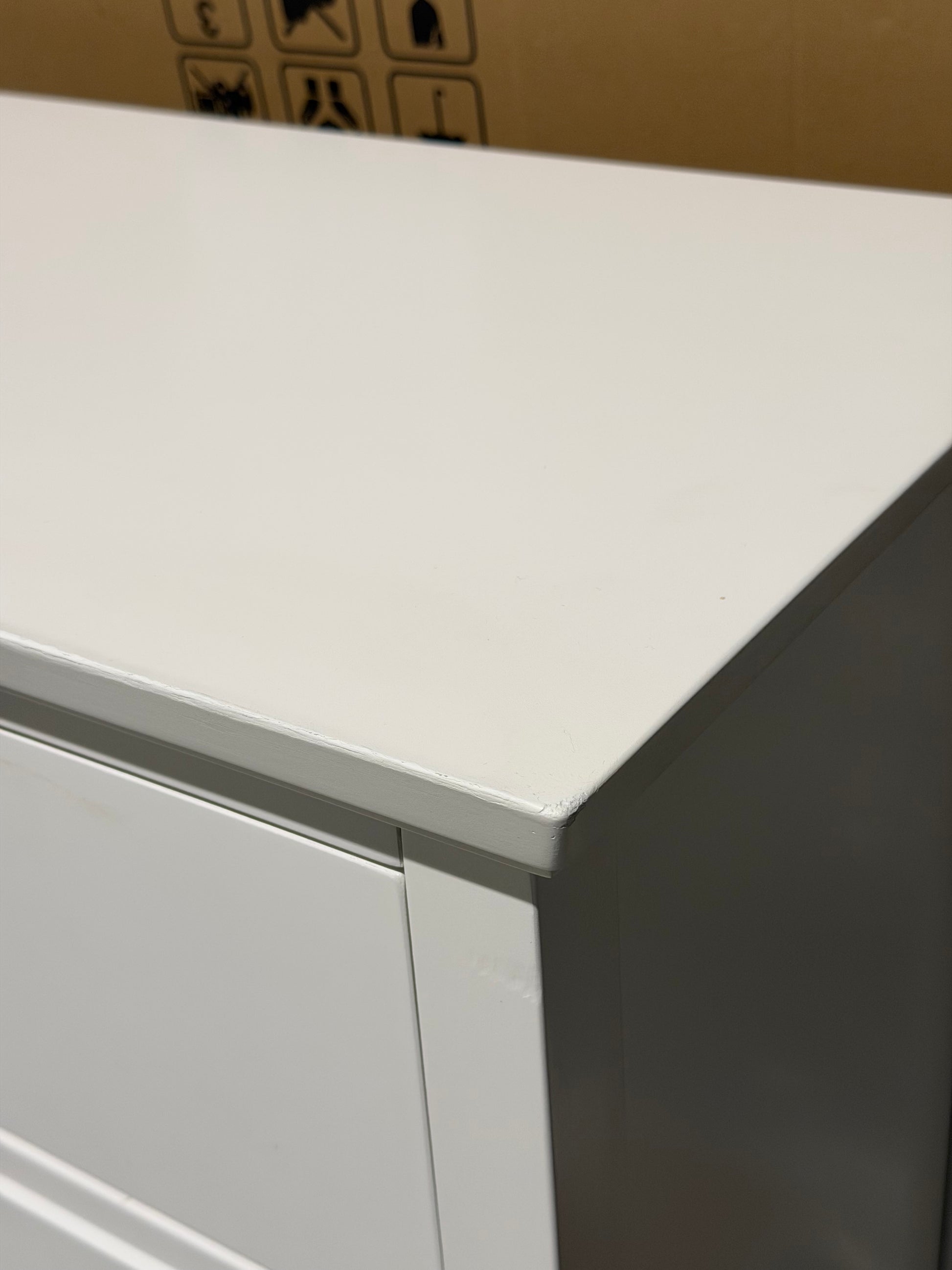Grade B- We received this item with a poor finish to the top corner, The HLW Team have repaired and resprayed to the top corner and then applied a coat of lacquer, the top is not perfect as you can see in the images. There are a few dinks to the edges of the drawer as pictured